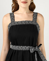 A graceful midi dress detailed with intricate embroidery along the belt, neckline, and straps. The delicate accents add just the right touch of elegance to its clean silhouette — perfect for effortless day-to-evening styling.