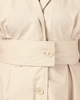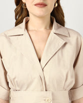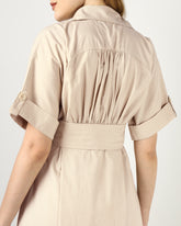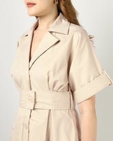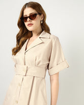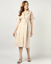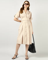 A beige midi dress designed with a sharp notched collar and button-down front for a clean, polished look. The wide belt cinches the waist for a flattering silhouette, while the softly gathered back adds a touch of ease. Effortlessly versatile for both casual and elevated occasions.