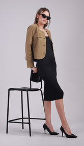 A chic cropped jacket crafted in a neutral brown tone, featuring a clean round neckline, front button closure, and flap pockets for a structured finish. Designed with full sleeves and a versatile silhouette, it’s perfect for layering over casual or smart looks.
