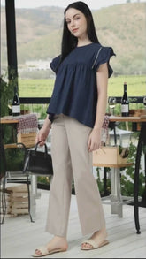 This indigo top features ruffled sleeves with ladder lace and soft gathers. Perfect for work or casual outings!